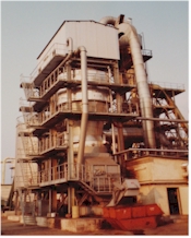 The picture shows a hot gas generator with integrated hot water heating through the furnace walls. This plant was built turnkey at the Kronospan factory in Sandebeck in 1984 and is still in operation today.